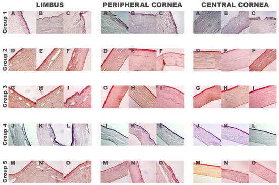Results of the histological evaluation (Figure 4) showed that rabbits treated only with medical treatment (control group) had the limbus area invaded with a conjunctival epithelium characterized by the presence of goblet cells. In the peripheral and central cornea, an abnormal epithelium with a few layers of epithelial cells, ulcers, blood vessels in the underlying stroma and inflammatory cell infiltration were observed in all rabbits in this group.