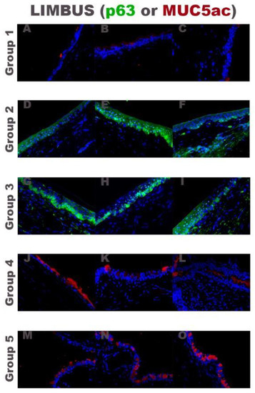 Immunofluorescence analysis (Figure 5) corroborated the histological analysis showing positive stain against MUC5ac in the limbal area of rabbits treated only with medical treatment (control group), rabbits transplanted with fibrin-PRGF membrane SLET (group 4) and rabbits transplanted with fibrin-PRGF membrane without rabbit cultured LEPCs (group 5). P63 expression was found mainly in the nucleus of the basal layer and a few in the suprabasal layer of the limbal epithelium in the groups of rabbits transplanted with autologous (group 2) or heterologous (group 3) LEPCs.