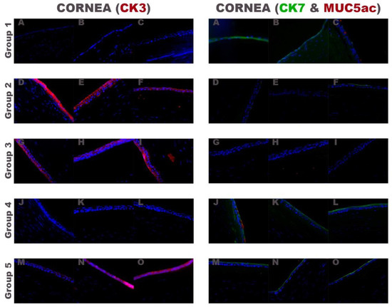 Immunofluorescence analysis of the central cornea with a CK3 positive (in red) multilayered corneal epithelium (left) or a CK7 positive (in green) conjunctival epithelium with or without the presence of MUC5ac positive (in red) cells (right). Group 1: only medical treatment (control group), Group 2: fibrin-PRGF membrane cultured with autologous rabbit LEPCs, Group 3: fibrin-PRGF membrane cultured with heterologous rabbit LEPCs, Group 4: fibrin-PRGF membrane SLET and Group 5: fibrin-PRGF membrane without rabbit cultured LEPCs. 400×. PRGF: Plasma Rich in Growth Factors; LEPCs: Limbal Epithelial Progenitor Cells; SLET: Simple Limbal Epithelial Transplantation.