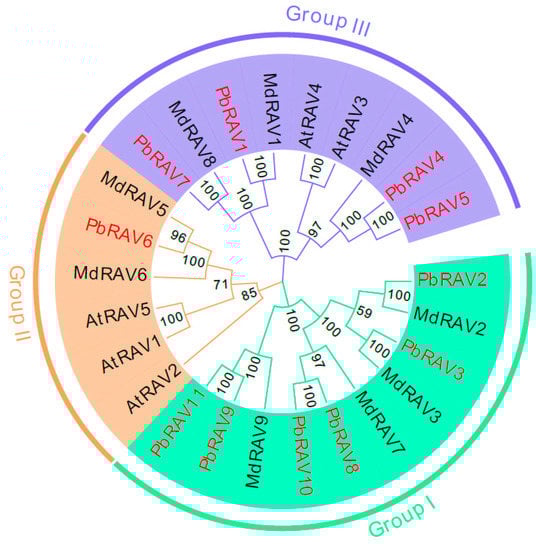 We examined the phylogenetic relationships among pear RAVs by generating a phylogenetic tree using the neighbor-joining method. The tree included 11 P. bretschneideri, 9 M. domestica, and 5 Arabidopsis RAV TFs (Figure 1). The family was divided into three groups (Figure 1). PbRAV2, PbRAV3, PbRAV8, PbRAV9, PbRAV10, and PbRAV11 were more closely related to MdRAV2, MdRAV3, MdRAV7, and MdRAV9 and were separate from the RAVs in Arabidopsis. PbRAV6 was in group II, while the other PbRAVs were in group I or III.