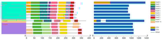 - Hu, B.; Jin, J.; Guo, A.Y.; Zhang, H.; Luo, J.; Gao, G. GSDS 2.0: An upgraded gene feature visualization server. Bioinformatics 2014, 31, 1296–1297. [Google Scholar] [CrossRef]