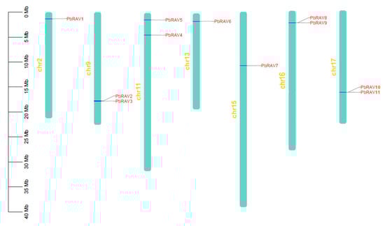 Chromosomal distribution of PbRAV genes drawn using MapChart v2.2. Scale represents chromosome length: 0–40 Mb.