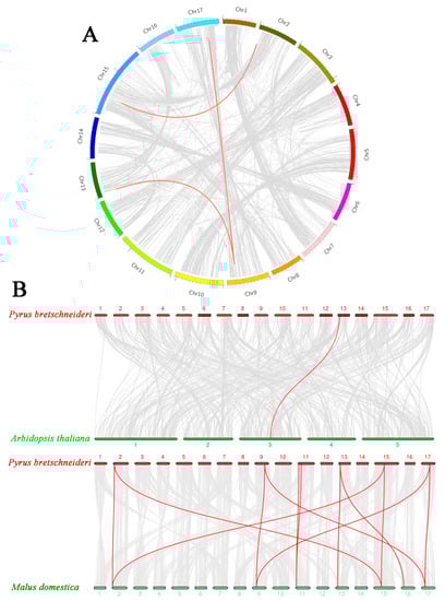Collinearity of RAVs. (A) Distribution of segmentally duplicated PbRAV genes on P. bretschneideri chromosomes. Gray lines indicate collinear blocks in the whole P. bretschneideri genome and red lines indicate duplicated PbRAV gene pairs. (B) Collinearity of P. bretschneideri, Arabidopsis, and M. domestica RAV genes. Red lines indicate the syntenic gene pairs.