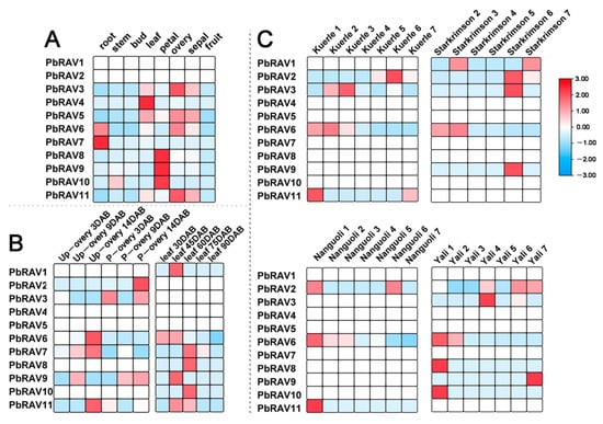 Expression profiles of PbRAVs in pear. (A,B) Expression profile of PbRAVs in different tissues (A) and in ovary and leaf at different development stages (B) of P. bretschneideri ‘Xinli No. 7.’ (C) Expression profile of PbRAVs at different fruit development stages in various P. bretschneideri varieties. P-ovary: pollinated ovary; Up-ovary: unpollinated ovary.