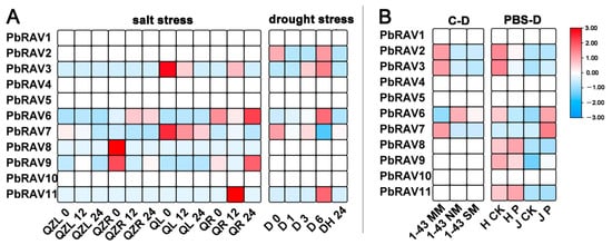 Expression profiles of PbRAV genes under abiotic and biotic stress. (A) Abiotic stress included salt and drought stress. (B) Biotic stress included cork spot and pear black spot disease. C-D: cork spot; MM: moderate disease mesocarp; NM: normal mesocarp; PBS-D: pear black spot disease; QL: ‘Qaup-1’ leaf, QR: ‘Qaup-1’ root; QZL: ‘Qingzhen D1’ leaf; QZR: ‘Qingzhen D1’ root; SM: severe disease mesocarp.
