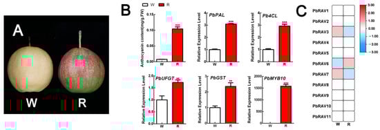 Expression profile of PbRAVs in red pear peel. (A) Appearance of ‘Xinqihong’ pear after bagging. (B) Anthocyanin content and expression of genes regulating anthocyanin biosynthesis. (C) Expression profile of PbRAVs in white and red pear peel. ** p < 0.01, *** p < 0.001 (Student’s t test). R: red pear peel; W: white pear peel. The expression levels of genes in the peel of white pear under control conditions were normalized as 1.0.