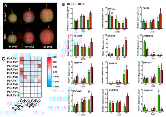 Expression profiles of PbRAVs in two pear cultivars during the fading period. (A) Morphological changes in ‘Xinli No. 7’ and ‘Xinqihong’ pear varieties during the fading period. (B) Anthocyanin content, expression of genes regulating anthocyanin biosynthesis, and expression of PbRAVs. (C) Expression profile of PbRAVs in the two pear cultivars. Different lowercase letters indicate statistical significance at p < 0.05 (Duncan’s test). The expression levels of genes in the peel of ‘Xinli No. 7’ pear at 87 DAB were normalized as 1.0. DAB: days after full bloom.
