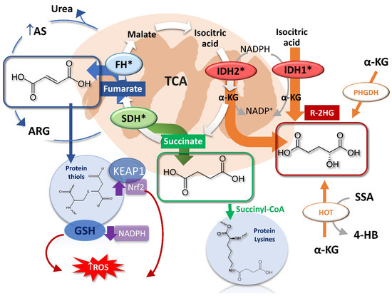 Oncometabolites production and reactions. Loss of function of mutated SDH and FH enzymes leads to the accumulation of succinate and fumarate that triggers post-translational proteins modifications such as succinylation and succination, respectively. The R-2HG derives mainly from the neomorphic catalytic activity of the mutated mitochondrial IDH2 and cytosolic IDH1, and less from non-canonical reactions involving the PHDGH and HOT enzymes. FH, fumarate hydratase; SDH, succinate dehydrogenase; α-KG, α-ketoglutarate; R-2HG, R-2-hydroxyglutarate; PHDGH, phosphoglycerate dehydrogenase; HOT, hydroxyacid-oxoacid-transhydrogenase; 4-BH, 4- hydroxybutyrate; SSA, succinic semialdehyde; AS, argininosuccinate; ARG, arginine.