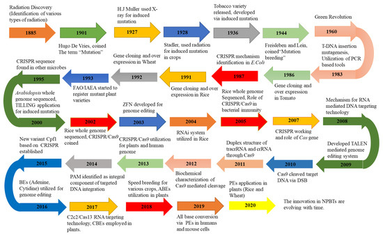 A brief history of different versions of GETs, showing historical events. CRISPR = clustered regularly interspaced short palindromic repeats; Cas9 = CRISPR-associated protein system 9; Cpf1 = CRISPR system from Prevotella and Francisella1; BEs = base editors; PEs = prime editors; T-DNA = transgenic deoxyribonucleic acid; PCR = polymerase chain reaction; FAO = food and agriculture organization; IAEA = international atomic energy agency; DSB = double-stranded breaks; RNAi = RNA interference; tracrRNA = trans-activating CRISPR RNA; PAM = protospacer adjacent motif; NPBTs = novel plant breeding techniques.