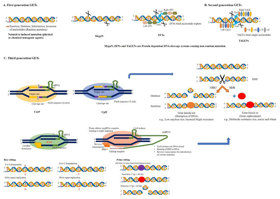 Schematic models of gene editing systems. (A) The first generation included induced mutation through mutagenic agents, Radiations and EMS (Ethyl methanesulfonate), meganuclease (MegaN), and Zinc finger nucleases (ZFNs); (B) second generation included transcription activator-like effector nucleases (TALENs); (C) third generation included the CRISPR-associated protein system 9 (Cas9), the CRISPR system from Prevotella and Francisella1 (Cpf1), BE and PEs. The GETs from MegaN, ZFNs, TALENs, CRISPR/Cas9, Cpf1 generate DSBs. BE and PE create mutations without DSBs. DSB = double-stranded breaks; dCas = catalytically inactive (dead) Cas; PAM = protospacer adjacent motif; PBS = primer binding site; NHEJ = non-homology end joining; HDR = homology-directed repair.