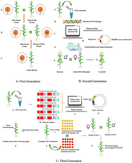 Schematic description all three generations of hybrid development. (A) First generation or three-line hybrid development system consisting of A (male sterile), B (male fertile), and R (restorer) lines; (B) second-generation or two-line hybrid development system through targeted mutagenesis of the P/TGMS gene, later crossed with restorer line; (C) third generation or MCS system through multiplexing of genes controlling MS, pollen lethality and color sorting. The mutants are backcrossed with selfing of the MCS maintainer line to develop desirable plants.