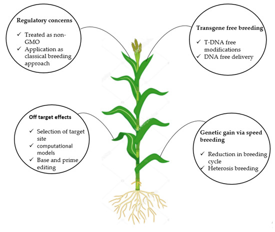 Recently, the PE system has achieved indels from approximately 44 to 80 bp and point mutations with more precision and efficiency. Protoplasts in nine lines of rice and seven lines of wheat showed a mutation efficiency of approximately 19.2% [82,83]. Hybridization of target DNA-pegRNA PBS and target DNA-reverse transcripts resulted in minimum off-target effects. The application of GETs for crop improvement programs helped to develop germplasms with better yield, enhanced resistance to biotic and abiotic stresses and increased climate resilience (Figure 2). Improved crops can help to ensure food security. Developing NPBTs for crop improvement programs is also of interest to stakeholders, especially to feed growing human populations.