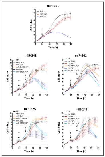 Identification of miRNAs with potential antiproliferative and chemosensitizing effects using high-throughput screening. SW1353 cells were seeded in triplicate in 96-well E-plates VIEW. They were grown for 24 h before transfection (arrow labeled with a T) with 20 nM of miR-Ctrl, miR-491-5p, miR-342-5p, miR-541-5p, miR-625-5p or miR-149-5p. The cells were also treated with 1 µg/mL of CDDP 24 h post-transfection or left untreated (arrow labeled with a C). Each condition was performed in triplicate. Real-time growth curves were monitored using the xCELLigence System. Impedance was recorded every 2 h for 120 h. Cell index profiles of one experiment per miRNA species, with mean ± SD, are shown. CDDP: cisplatin, Ctrl: control.