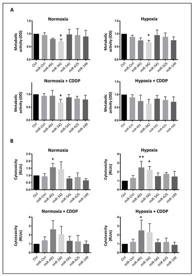 Afterwards, we investigated the potential chemosensitizing effect of the five miRNAs of interest (Figure 2A). Upon sublethal exposure to CDDP, only the cells treated with miR-342-5p under normoxic conditions experienced a significant decrease in their metabolic activity (0.75-fold decrease relative to miR-Ctrl/CDDP-treated cells, p < 0.05). In all cases, the metabolic activity did not further decrease with the combination of miRNAs and CDDP, compared with miRNAs alone.