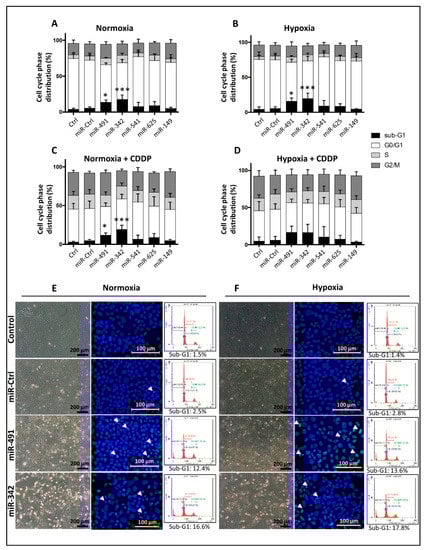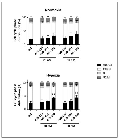 Regardless of the oxic conditions, miR-491-5p and miR-342-5p increased the percentage of sub-G1 events, by 2.8-fold average increase under normoxia and by 3.4-fold average increase under hypoxia (p < 0.05 and p < 0.001 relative to miR-Ctrl-treated cells in each group; Figure 3A,B). There was also a decrease in cellular density, more cellular debris and condensed and/or fragmented chromatin—typical of apoptotic cells—after miR-491-5p and miR-342-5p transfection (Figure 3E,F).