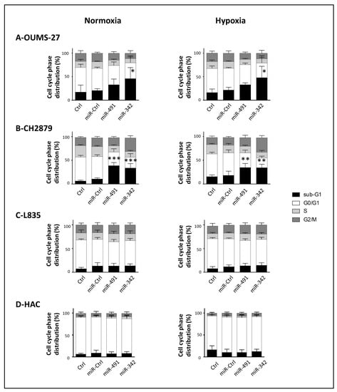 We thus focused subsequent investigations on these two miRNAs and assessed their effects on three other chondrosarcoma cell lines (OUMS-27, CH2879 and L835) and on primary human articular chondrocytes (HACs) as healthy controls (Figure 4). In OUMS-27 cells, miR-491-5p increased the percentage of sub-G1 events under normoxia and hypoxia (by 1.6- and 1.5-fold, respectively, but this increase was not significant; Figure 4A). MiR-342-5p induced a 2.2-fold increase (p < 0.05) in the sub-G1 peak compared with miR-Ctrl-treated cells, under both oxic conditions. In CH2879 cells, miR-491-5p significantly increased the percentage of sub-G1 events (by 3.6-fold under normoxia (p < 0.001) and 1.9-fold under hypoxia (p < 0.01); Figure 4B). MiR-342-5p also raised the percentage of sub-G1 events (by 3.2-fold under normoxia (p < 0.001) and 1.9-fold under hypoxia (p < 0.01)). The increase in sub-G1 peaks with miR-491-5p and miR-342-5p, indicating induction of cell death in both cell lines, was supported by the extensive cellular debris and numerous apoptotic cells observed under fluorescence microscopy on DAPI-stained slides (Figure S4). In L835 cells, miR-491-5p and miR-342-5p did not induce any cell cycle arrest, nor did they significantly alter the sub-G1 peak, regardless of the oxic conditions (Figure 4C and Figure S5A). Therefore, these two miRNAs did not induce cell death in this chondrosarcoma cell line. We observed similar results for primary HACs transfected with miR-491-5p and miR-342-5p, in both oxic conditions, suggesting that these miRNAs have no cytotoxic effects on healthy cartilage cells (Figure 4D and Figure S5B).