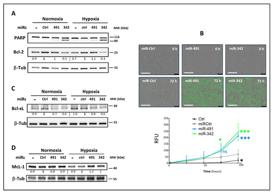Analysis of the apoptotic effects of miR-491-5p and miR-342-5p on SW1353 cells. In parts (A,C,D), SW1353 cells were cultured under normoxia or hypoxia. They were transfected 24 h after seeding with 20 nM of miR-Ctrl, miR-491-5p or miR-342-5p. Analyses were carried out 72 h post-transfection. Protein extracts were analyzed with Western blots to evaluate PARP, Bcl-2, Bcl-xL and McL-1 levels versus a β-tubulin (β-Tub) loading control. Representative blots of three independent experiments are shown. Protein expressions are indicated at the bottom of the blots. They were normalized to β-tubulin and to the corresponding miR-Ctrl for each oxic condition. (B) SW1353 cells were cultured under normoxia and transfected 24 h after seeding as before. Caspase-3/7 activity was then assessed in real time for 96 h, as described in the Materials and Methods section. The images shown are representative of the experimental results obtained. Scale bar: 400 µm. The graph provides the analysis of fluorescence of four independent experiments (mean RFU ± SD). The significance of the results between miR-Ctrl and miRNA-treated cells was assessed using two-way ANOVA (*: p < 0.05, ***: p < 0.001).