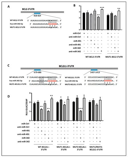 Inhibition of both BCL2 and BCL2L1 mRNAs by miR-342-5p and of BCL2L1 mRNA by miR-491-5p. (A) The 3’UTR sequence of BCL2 was aligned with the conserved sequence complementary to hsa-miR-342-5p. Wild (WT) and mutant (MUT1) luciferase vectors of BCL2-3’UTR are shown. (B) WT and MUT1 reporter vectors of BCL2-3’UTR (0.25 ng/µL) were co-transfected with the indicated miR or anti-miR (20 nM) in SW1353 cells. (C) The 3’UTR sequences of BCL2L1 were aligned with the conserved sequence targeted by hsa-miR-342-5p. WT and mutants (MUT1, MUT2) luciferase vectors including BCL2L1-3’UTR are shown. The MUT1/MUT2-BCL2L1-3’UTR vector contains both mutations 1 and 2. (D) WT and mutant vectors of BCL2L1-3’UTR (1 ng/µL) were co-transfected with the indicated miR or anti-miR (20 nM) in SW1353 cells. (B,D) SEAP and GLUC luciferase activities were measured 24 h post-transfection. GLUC activity was normalized to SEAP activity and expressed as RLU. The data show a representative experiment (mean ± SD) of four independent experiments performed in triplicate. The significance of the results between miR-Ctrl and miRNA- or anti-miRNA-treated cells was evaluated by two-tailed Student’s t-test (*: p < 0.05, **: p < 0.01, ***: p < 0.001).