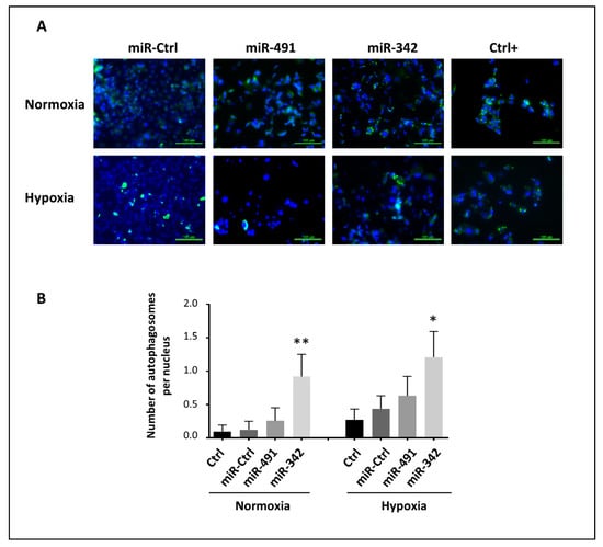 Whatever the oxic conditions, miR-491-5p did not significantly modulate the number of marked autophagosomes (Figure 7). MiR-342-5p significantly increased the number of autophagosomes under normoxia (by 7.4-fold relative to miR-Ctrl-treated cells, p < 0.01), and to a lesser extent under hypoxia (by 2.8-fold, p < 0.05). Therefore, miR-342 increases the autophagic activity of SW1353 cells, which may participate in its tumor-suppressive activity.