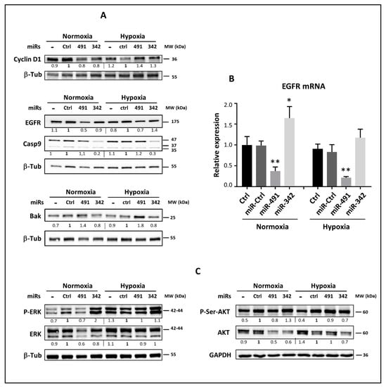 Analysis of some survival/death proteins and mitogenic signaling pathways affected by miR-491-5p and miR-342-5p. SW1353 cells were cultured and transfected as described in Figure 5. Analyses were carried out 72 h post-transfection. (A,C) Protein extracts were analyzed with Western blots to evaluate the levels of Cyclin D1, EGFR, Caspase-9, Bak, P-Thr202/Tyr204-ERK, ERK, P-Ser473-AKT and AKT versus β-tubulin (β-Tub) or GAPDH. Representative blots of three independent experiments are shown. Protein expressions are indicated at the bottom of the blots. They were normalized to β-tubulin or GAPDH, and to the corresponding miR-Ctrl for each oxic condition. (B) Total RNA was extracted as described in the Materials and Methods section. Relative expression of EGFR was determined by RT-quantitative PCR and normalized to both PPIA1 and GAPDH levels and to Ctrl. Data are expressed as mean of triplicate samples ± SD. The results are representative of three independent experiments. The significance of the results was evaluated by two-tailed Student’s t-test compared with the corresponding miR-Ctrl (*: p < 0.05, **: p < 0.01).