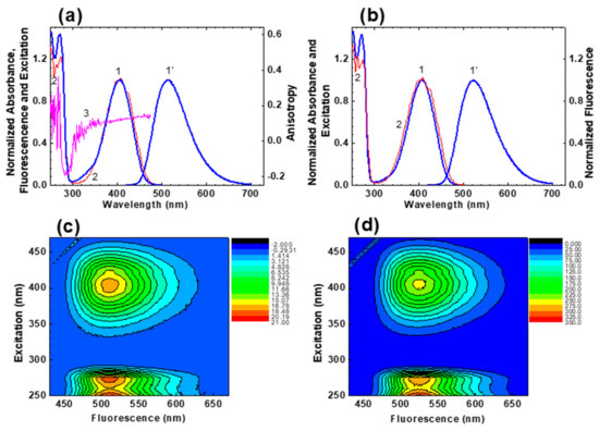 Normalized steady-state absorption (1), fluorescence (1′), and excitation (2) spectra of HPPT in methanol (a) and water (b). Excitation anisotropy spectrum of HPPT in glycerol ((a), curve 3) and 3D fluorescence maps for HPPT in methanol (c) and water (d).