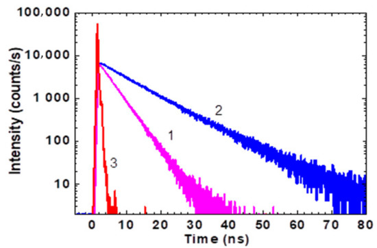 The steady-state fluorescence spectra of HPPT were fully independent of (see 3D fluorescence maps in Figure 1c,d), exhibited relatively large Stokes shifts (>5000 cm−1) and weak solvatochromic behaviour (Figure 1a,b, curves 1′). All observed fluorescence decay processes were characterized by a single exponential profile (Figure 2) with corresponding lifetimes, , in the range of 4–10 ns (Table 1). The values of were also estimated from the experimental data based on the equation , where the natural lifetime, , can be determined from the Strickler-Berg approach, as [18]: