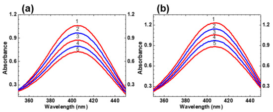 Consecutive changes in the main absorption band of HPPT in methanol (a) and water (b) under irradiation at ≈400 nm with average irradiance ≈ 40 mW/cm2 and irradiation times: 0 min (1), 4 min (2), 8 min (3), 12 min (4), and 16 min (5).