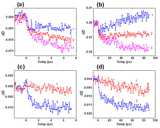 Time-resolved transient absorption spectra and attributes of fast relaxations in the excited state of HPPT were investigated in methanol solution under femtosecond excitation in the main long wavelength absorption band at ≈ 400 nm. The dependences of the induced optical density, , on the temporal delay, , between pump and probe pulses are presented in Figure 4 for specific probing wavelengths, . Transient absorption kinetics of HPPT revealed relatively fast rise time signals (≤0.5 ps) with following dynamic changes on the picosecond time scale that, in general, can be attributed to ESA, saturable absorption (SA), and optical amplification (gain) processes [23,24]. All of the kinetic curves start with negative signals ( < 0), which gradually decrease to the positive values, remain constant, or further increase depending on the spectral range (460–480 nm, 500–520 nm, and 530–620 nm, respectively). These relatively long changes are described by the characteristic times in the range of 20 to 30 ps and can be attributed to solvent reorganization phenomena, frequently observed for different organic molecules in protic solvents [25,26,27,28]. The largest values of the first emerged subpicosecond negative signals were observed in the short wavelength range ( ≤ 550 nm, Figure 4a,b) and are, presumably, associated with the dominant role of optical gain from the unrelaxed first excited state S1 along with some possible input from the SA of the ground state S0. These negative signals gradually change to positive ones at ~ 470 nm in the next 20–30 ps (Figure 4b, curve 1) as evidence of substantial input of ESA processes. In contrast, further increase in the negative was observed in the spectral range ≥ 530 nm (Figure 4a,b, curves 3, Figure 4c,d), which can be explained by the increased role of optical gain.