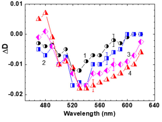 According to these data, the linear absorption spectra were nearly independent of solvent property and exhibited no vibrational structure and relatively small extinction coefficients in the main long wavelength absorption band (maximum values, ~ (3.0–3.5)∙103 M−1cm−1). The steady-state absorption and excitation spectra are nicely overlapped with each other (see Figure 1a,b, curves 1 and 2), and is an evidence of negligible dependence of the fluorescence quantum yield, , on the excitation wavelength, , and corresponding validity of the Kasha’s rule [16].