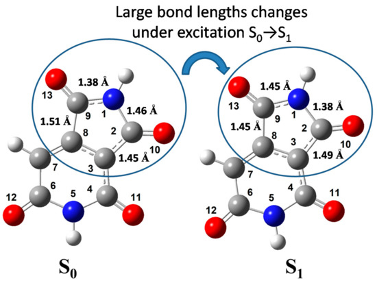 The values of calculated atomic charges and bond lengths are presented in Table 2, along with the corresponding changes in these values under electronic excitation S0 → S1. From the obtained data, one can see that the total negative charge is distributed dominantly at the oxygen and nitrogen atoms, while the carbon atoms bear the appreciable positive charges because of the polarization of the C-O and C-N bonds [35,36,37,38]. The electronic excitation S0 → S1 of the anionic HPPT molecule causes noticeable redistribution of the electron occupancies at both atoms and bonds. It should be mentioned that the length of four C = O bonds are minimal in both states, S0 and S1, and practically insensitive to the electronic excitation. By contrast, some C-C bonds (C2-C3, C8-C9) and C-N bonds (N1-C2, N1-C9, C4-N5) change their lengths appreciably upon excitation. It is reasonable to assume that just the changing of these bond lengths cause relatively large Stokes shift that are experimentally observed for HPPT (see Table 1).