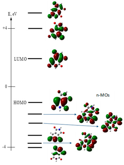 The primary calculated electronic parameters, obtained for the optimized molecular geometry in S0 (for absorption) and S1 (for fluorescence) states, including frontal and nearest molecular orbitals (MOs) of HPPT, are presented in Table 3 and Figure 7, respectively.