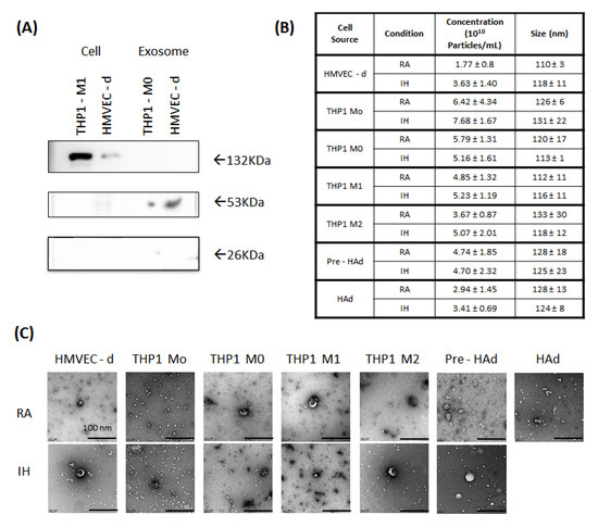 EVs derived from different cells lines exposed to IH or RA were characterized using nanoparticle tracking analyzer (NTA), Western blots (WB), and transmission electron microscopy (TEM). Western blot (WB) confirmed the presence of CD63 and CD81 (exosome markers) and the absence of the Golgi apparatus marker GM130 in all EVs isolates (Figure 1A). These CD63 and CD81 proteins are part of tetraspanins super protein family and they are routinely used as positive exosome markers.