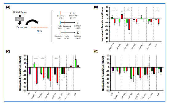 Effect of extracellular vesicles (EVs) on naïve human microvascular endothelial cell (HMVEC - d) tight junction barrier function using ECIS array. (A) Graphical scheme of the analyses performed. (B) Results from ECIS array after directly exposure to EVs from the different cell sources exposure to both room air (RA, green) and intermittent hypoxia (IH, red). (C) Results from ECIS array preconditioned for 6 h with hydrogen peroxide and followed by treating cells with EVs from all cell origins both RA (green) and IH (red). (D) Results from ECIS array preconditioned with EVs from all cells sources both RA (green) and IH (red), and addition of hydrogen peroxide after 6 h. * indicates statistical significance, * p < 0.05, ** p < 0.01.