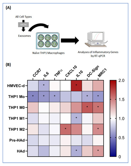 Effect of extracellular vesicles (EVs) on naïve THP1 macrophages. (A) Graphical flowchart of the methods used. (B) Heat-map corresponding to the fold change between room air and intermittent hypoxia conditions analyzed in four pro-inflammatory genes (CCR7, IL6, TNFα and CXCL10) and three anti-inflammatory genes (IL10, DC-Sign and MRC1). * indicates statistical significance, * p < 0.05.