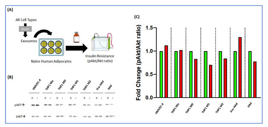Effect of extracellular vesicles (EVs) on naïve human adipocytes. (A) Graphical scheme of the analysis. (B) Representative image of bands obtained in the western blot for Akt and pAkt after treatment with EVs from human microvascular endothelial cells (HMVEC-d), THP1 monocytes (THP1 Mo), THP1 macrophages (THP1 M0), THP1 macrophages M1 stimulated (THP1 M1), THP1 macrophages M2 stimulated (THP1 M2), human pre-adipocytes (Pre-HAd) and human adipocytes (HAd) after both room air (R) and intermittent hypoxia (I) exposures. (C) Results obtained after quantifying the bands for the ratio pAkt/Akt for EVs from all cell sources after both room air (green) and intermittent hypoxia (red).