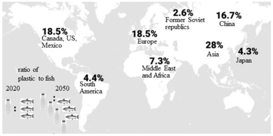 Plastics are man-made, high molecular weight organic polymers obtained from nonrenewable petrochemicals like fossil oil, natural gas, and coal. They are composed of hundreds to thousands of organic subunits (“monomers”) linked with strong covalent bonds. Plastics’ invasive entrance into human life during the last century has resulted in replacement of their natural counterparts in almost all industrial and domestic areas of human life. The versatility, durability, and remarkable adaptability of this group of materials improved society’s living standards, making life easier, safer, and more colorful. Their properties, such as light weight, low production cost, ease of manufacturing, bio-inertia, and resistance to environmental influence and microbial action, contribute to plastics’ extensive commercialization. According to the last report of Plastics Europe [], everyday plastic use has shown an exponentially increasing trend for production and consumption, reaching about 350 million tons in 2019. However, a sharp growth rate drop of 8.5% was registered in 2020 due to COVID-19. The production level before the COVID-19 pandemic in the EU27 will not be reached again until 2022. Employed in the European plastics industry are more than 1.56 million people in 55,000 companies with over 350 billion euros of turnover. As can be seen from Figure 1, plastic producers are spread worldwide, the biggest contributors being Asia, Europe, and North America.