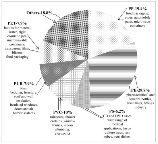 The first synthetic polymer, Bakelite, was produced in the beginning of 20th century; the true mass production of plastics thrived from the 1950s onwards. Over that period, their properties have been continuously improved. The most widely used polymer materials are polyethylene (PE), polypropylene (PP), polystyrene (PS), polyvinyl chloride (PVC), polyurethane (PUR), poly(ethylene terephthalate) (PET), poly(butylene terephthalate) (PBT), and nylons []. Currently, more than 5300 grades are produced for plastic commerce with a range of chemical additives including plasticizers, pigments, stabilizers, surfactants, and inorganic fillers []. Plastics have a wide range of applications in the industries for food and packaging, pharmaceuticals, agriculture, cosmetics, detergents and chemicals, etc. (Figure 2). Synthetic plastics have taken an impressive position in the packaging sector as a replacer of cellulose-based wrapping materials and now account for around 40% of the plastics produced in Europe [].