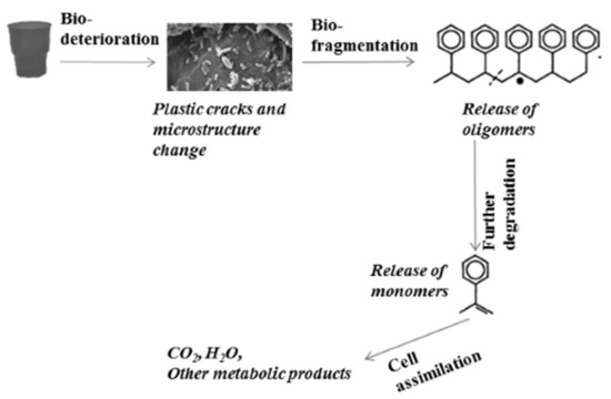 Biodegradation is the process of degradation of large polymer molecules by groups of living organisms, some of which break down the polymer chain into oligomers and monomers. Others are able to use these products, converting them to simpler waste compounds, and still others are able to use the excreted wastes. Microbial degraders and their metabolic enzymes are among the environmental agents that participate in the degradation process, which results in a conversion of the carbon in the polymer chains into smaller biomolecules or into carbon dioxide and water []. In this way, they contribute to soil fertility, decrease plastic accumulation in the environment, and reduce the cost of waste management. Furthermore, biodegradable plastics could be useful for the production of valuable metabolites (monomers and oligomers) []. The biodegradation rate is strongly influenced by several polymer properties, such as the presence of branching and additional functional groups that promote higher hydrophilicity; the relative share of crystalline and amorphous regions; the presence of polar covalent bonds, such as ester or amide bonds, instead of carbon–carbon bonds; the molecular weight and length of the carbon chain; the size and form of the substrate (powder, fibers, pellets, films); environmental agents like UV, pH, temperature, and moisture; and the enzyme characteristics []. Additionally, the rigidity could be increased by antioxidants and stabilizers added during plastic production. According to the rate of biodegradation, plastics are divided in two main groups: biodegradable, characterized by a higher rate process, and non-biodegradable, the biodegradation of which is slow or mediated by a still-unknown process. Most currently used fossil-based plastics are non-biodegradable, e.g., PE, PP, PS, and PVC. As large molecules of polymers cannot enter directly into the microbial cell, microorganisms responsible for primary degradation carry out extracellular degradation, and the received intermediates are further degraded by secondary degraders. According to Dussud and Ghiglione [], biodegradation occurs in four main steps (Figure 3).