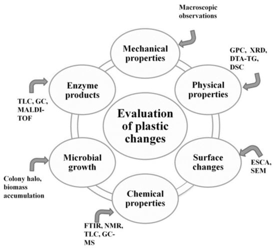- Evaluation of visible changes in plastics such as appearance of holes or cracks, changes in surface view or color, or formation of biofilms. Scanning electron microscopy (SEM) and atomic force microscopy (AFM) represent good approaches for more sophisticated observations.