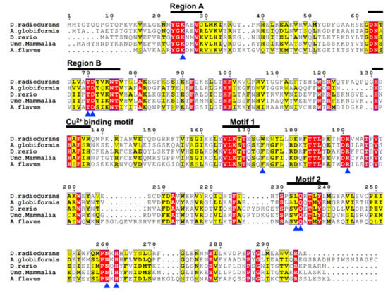 As described in previous studies, the urate oxidase family commonly contains two conserved regions and two motifs, defined as region A (Y/H-G-K-X-X-V), region B (N-S-X-V/I-V/I-A/P-TD-S/T-X-K-N), motif 1 (V-L-K-T-T-Q-S), and motif 2 (S-P-S-V-Q-K/H/N-T-L-Y), respectively [23,24]. From multiple sequence alignment (Figure 1), DrUox shares identical sequences within region A. However, several amino acids of DrUox sequence within region B are not conserved; in 64N-T-D-L-V-A-T-D-T-V-R-75N, the 65T, 67L and 74R could be distinct. Motif 1 and 2 in DrUox show nearly consensus patterns; only 170E in Motif 1 and 233L, 235R in Motif 2 are changed. Additionally, some eukaryotic urate oxidases are copper ion-binding proteins [23,25]; the putative cooper ion-binding motif, H-X-H-X-F, was also found in DrUox (Figure 1). Furthermore, the critical catalytic residues of DrUox present in the dimeric interfaces were found to be highly conserved and are marked with a blue arrowhead in Figure 1, which indicates the conserved catalytic mechanism of the urate oxidase family.
