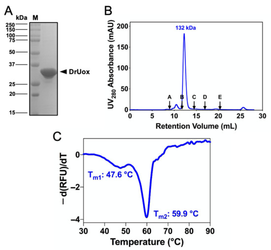 To produce recombinant DrUox, the DrUox gene (Gene ID: DR_1160) was cloned and heterologously expressed in E. coli BL21 (DE3) (Supplementary Figures S1 and S2). The N-terminal His6-tagged recombinant DrUox was then purified by Ni-NTA affinity chromatography. After purification, the DrUox protomer was 33 kDa, which was >98% pure as determined by SDS-PAGE (Figure 2A). Moreover, size-exclusion chromatography (SEC) revealed that DrUox is a tetrameric protein in the native state (Figure 2B). Thus, DrUox may form a canonical homo-tetramer as do other urate oxidases [26].
