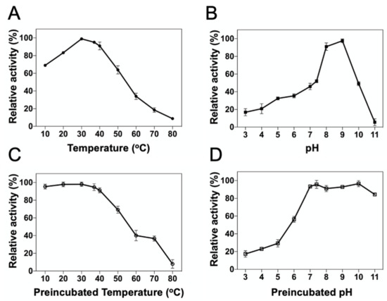 Temperature and pH effect on enzyme activity and stability of DrUox. (A) Optimal temperature was evaluated by incubating 0.5 μM DrUox and 500 μM uric acid in a temperature range of 10 °C to 80 °C for 3 min in pH 9.0. (B) Optimal pH was evaluated by incubating 0.5 μM DrUox and 500 μM uric acid in a pH range of 3.0 to 11.0 for 3 min at 30 °C. (C) Temperature on DrUox stability was determined under the optimal condition after preincubating DrUox at temperatures ranging from 10 °C to 80 °C for 0.5 h. (D) pH stability of DrUox was determined under the optimal condition after preincubating DrUox in pH buffers ranging from 3.0 to 11.0 for 24 h at 4 °C. The DrUox activity under different conditions were assayed by monitoring the depletion of uric acid in absorbance at 293 nm.