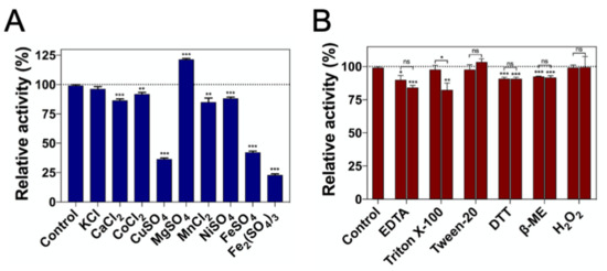 Effect of various metal ions and chemical agents on the enzyme activity of DrUox. (A) To evaluate the effect of metal ions on DrUox activity, the purified enzyme was preincubated for 1 h with the following salts: 2 mM each of KCl, CaCl2, CoCl2, CuSO4, MgSO4, MnCl2, NiSO4, FeSO4 and Fe2(SO4)3. (B) To evaluate the effect of chemical agents, the enzyme was incubated with 10 and 20 mM EDTA, DTT, β-ME; 1% and 2% of Triton X-100 and Tween-20; and 0.2 and 0.5 mM of H2O2. The enzymatic activity was measured under optimal conditions. The activity without the addition of the above chemicals was designated as 100%. Data are mean ± SEM (n = 3) and shown in Supplementary Table S1. * p < 0.05, ** p < 0.005, *** p < 0.0005; ns, not significant, determined by Student’s t-test.