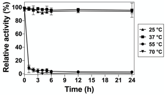 The long-term thermal stability of DrUox. The enzyme preincubated at 25 °C (black triangles), 37 °C (black squares), 55 °C (black circles), and 70 °C (inverted black triangles) for each time point (1, 2, 3, 4, 5, 6, 12 and 24 h) were collected and the residual activity was assayed under the optimal condition.