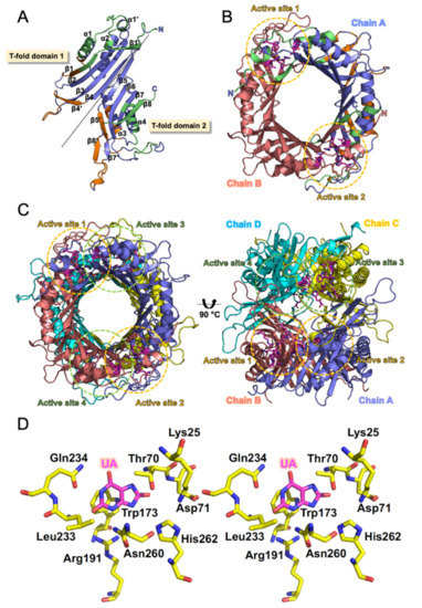 As shown in Figure 6B, two monomeric subunits (Chain A and B) are related by a crystallographic two-fold symmetry axis and are assembled as a dimer because of tight interactions. The dimer interface and tunnel formation contain two major regions, one formed by β1, β1′, α1, and α1′ from T-fold domain 1 and the other formed by β7, β8, α4, the β5–β6 loop, and the C-terminal loop from T-fold domain 2 (Figure 6A,B). The functional unit of the DrUox tetrameric structure is formed by the oligomerization of pairwise dimers (Chain A + B and Chain C + D; Figure 6C). The tetrameric interface region from the stacked dimers consists of parts of β1, α1, and β4′ from T-fold domain 1 and α3, β5′, β8′, and the β7′–β8′ loop from T-fold domain 2 (Figure 6A). Notably, the C-terminal loop present in the previous reported thermostable urate oxidases [20] was absent in DrUox. However, DrUox still exhibited thermal stability under mesophilic conditions. Altogether, the tetrameric conformation of DrUox may be stabilized by a combination of dimeric and tetrameric interface interactions.