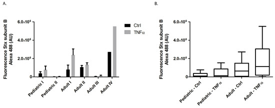 The binding of Alexa 488 labelled Stx-B on the endothelial cell surface of HGMVECs using flow cytometry. (A) Primary HGMVECs from two pediatric donors and four adult donors were incubated without (black bars) or with 10 ng/mL TNFα (grey bars) for 24 h. TNFα upregulated Stx-B binding in all six donors. (B) Results as shown in A expressed as pediatric vs. adult group. There was no significant difference between the pediatric vs. adult control groups or the pediatric vs. adult TNFα groups, in their ability to bind Alexa 488-labeled Stx-B (p = 0.145 for ctrl and p = 0.066 for TNFα by Mann−Whitney test). Mean values and SEM are given. Experiments were performed three times for pediatric donor I and II, adult donor I and III. Experiments were performed twice for adult donor II and once for adult donor IV.