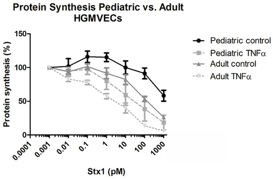 The cytotoxic effect of Stx-1 on primary pediatric and adult HGMVECs was investigated by using a 3H-leucine incorporation assay/protein synthesis assay. Stx-1 concentrations were derived from experiments and results published in the past []. Stx-1 at concentrations ranging from 0.001 pM till 1000 pM affected protein synthesis in a concentration-dependent manner with a 20–40% increase in protein synthesis inhibition when cells were preincubated with 10 ng/mL of TNFα for 24 h (Figure 2). The protein synthesis of HGMVECs derived from two pediatric tissues (pediatric I and II) incubated with 1000 pM of Stx1 for 24 h decreased by 40% in the control group and with 80% in cells prestimulated with TNFα (Figure 2). In contrast, the protein synthesis of primary HGMVECs derived from three adult tissues (adult V, VI, VII) incubated with 1000 pM of Stx1 for 24 h decreased by 75% in the control group and 95% in cells prestimulated with TNFα (Figure 2). In summary, primary HGMVECs from adult kidney tissues showed a tendency towards a higher sensitivity for Stx-1 in terms of protein synthesis inhibition compared to HGMVECs derived from pediatric tissues.