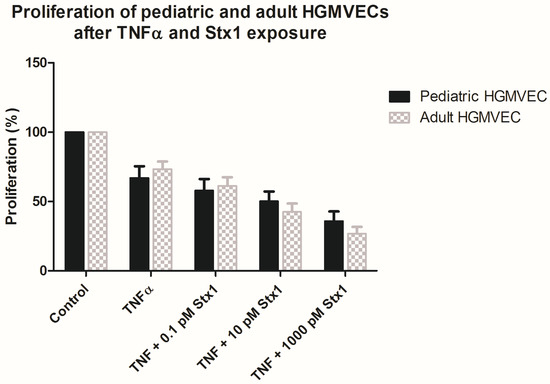 The effect of Stx-1 on the proliferation of HGMVECs by using a BrdU proliferation assay. Cells were incubated for 24 h with TNFα 10 ng/mL alone or preincubated with TNFα and incubated with 0.1, 10 and 1000 pM Stx-1. No significant difference by Mann−Whitney test was found between pediatric and adult HGMVECs for any single condition. Mean values and SEM are given. Experiments were executed in duplicate. Experiments were performed five times with HGMVECs from pediatric donor I and pediatric donor II. Experiments were performed five times with HGMVECs from adult donors III, three times with HGMVECs from adult donor I and twice with HGMVECs from adult donors II, IV and VIII.