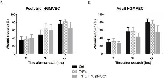 The effect of Stx-1 on wound closure of HGMVECs. (A) Primary pediatric HGMVECs or (B) adult HGMVECs were incubated with 10 ng/mL of TNFα or incubated with TNFα in combination with 10 pM Stx-1 for 12 h. A manual scratch wound was created, and images were taken after 0, 4, 8 and 12 h. No significant difference by Mann−Whitney test was calculated when the wound closure of pediatric HGMVECs was compared with the wound closure of adult HGMVECs, however a tendency towards a faster wound closure was measured when pediatric HGMVECs were used. Mean values and SEM are given. Experiments were performed three times with HGMVECs from pediatric donor I and donor II, three times with HGMVECs from adult donor I, twice with HGMVECs from adult donor III and once with HGMVECs from adult donor II and adult donor IV. Ctrl = control.