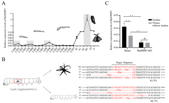 Analysis of expression characteristics of BmMMP1 in silkworm trachea. (A) The expressions of BmMMP1 mRNA levels during trachea development in B. mori. L3–L5, third to fifth larval instars; W, wandering stage; S, Spinning stage; PP, prepupal stage; P, pupal stage; A, adult stage. The gray rectangles were used to mark the BmMMP1 highly expressed periods. The morphology of silkworm at each stage appears in the corresponding developmental stage. (B) DNA sequencing analysis of the CRISPR/Cas9 editing BmMMP1 in trachea and tissues without trachea. 83.3% represented the knockout efficiency of BmMMP1 in the trachea and 86.7% represented that in tissues without trachea. The target sequence as the mark shows. (C) The expressions of BmMMP1 mRNA levels in the trachea and tissues without trachea of WT and mutants. The samples in results B&C are silkworms in L5D1. (ns, p ≥ 0.05; * *, p < 0.01).